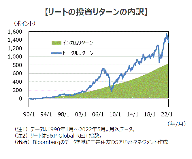 ■念の為、リートへの投資から得られたリターンの内訳を確認します。1990年に遡り、グローバルリートに投資した場合の価格と配当から得られるトータルリターンの累計を分析し、トータルリターンに占める、配当から得られるインカムリターンの割合いを計算しました。それによると、22年5月末時点でインカムリターンの割合いは65%となっています。