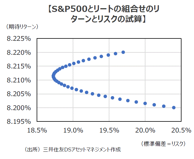 ■S&P500の期待リターンは8.2%、リスク(標準偏差)は19.7%、グローバルリートの期待リターンは8.2%、リスクは20.4%と想定します。期待リターンとリスクは弊社の予想値です。また、両指数の相関係数は0.75です。これは、過去データに基づき求めました。