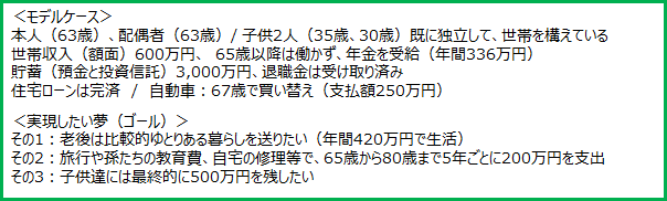本年2月の前回は「45歳4人家族、豊かな老後を送るには」として、資産形成のモデルケース(その1)をご紹介させていただきました。今回は「63歳4人家族」を想定して、どのような資産形成が望ましいのかを考えてみたいと思います。今回のモデルケースは以下の通りです。