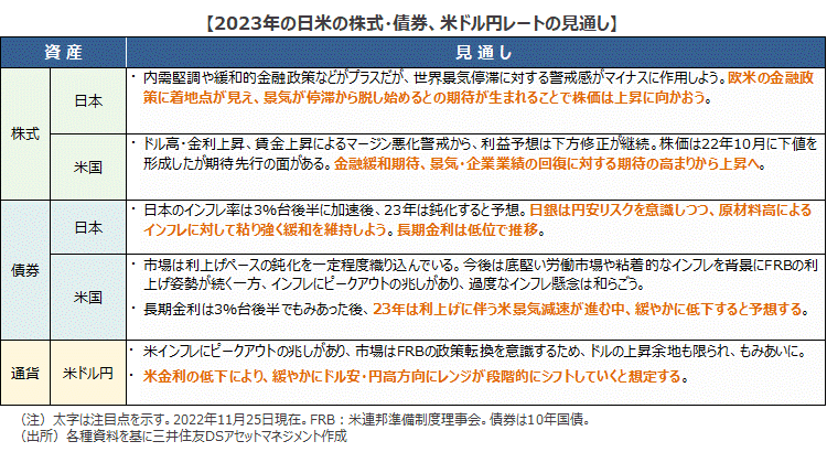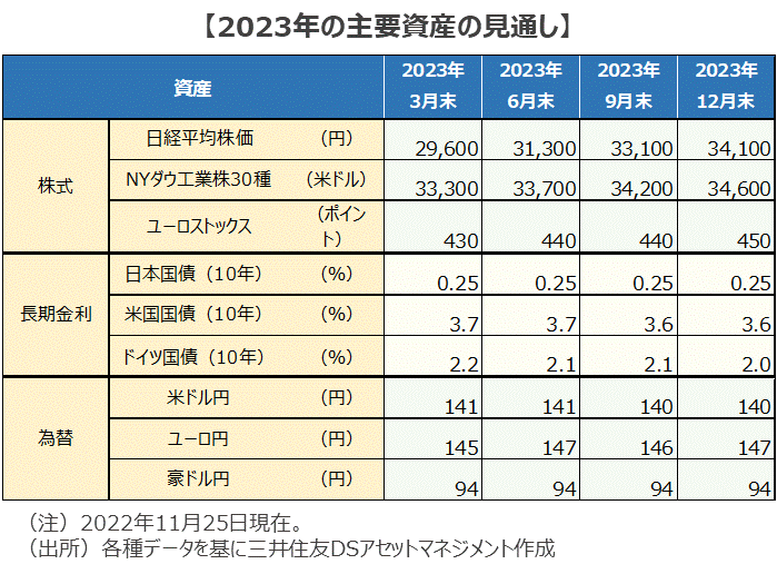 ■金融政策は大きな転換点を迎えることとなります。弊社は米連邦準備制度理事会(FRB)が2023年3月にフェデラルファンド(FF)レートを4.75-5.00%とした段階で利上げは終了するとみています。欧州中央銀行(ECB)は5月に利上げを終了するとみており、これで世界的な利上げ局面は終息する見通しです。23年中は金融政策の変更はないとみていますが、市場では景気回復を支援するためにFRBが金融緩和に動き出すのではとの期待が強まることも考えられます。