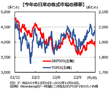 ■2022年3月に始まった米国の大幅かつ急ピッチな利上げや原油価格などの下落により、ようやく足もとでは消費者物価指数(CPI)の上昇にもピークアウトが見られてきました。12月には、FRBは利上げ幅をこれまでの0.75%から0.50%へと縮小し、利上げペースの減速を決定しました。市場では2023年前半にも利上げは停止され、FRBは様子見姿勢に転じるとの見方が大勢です。
