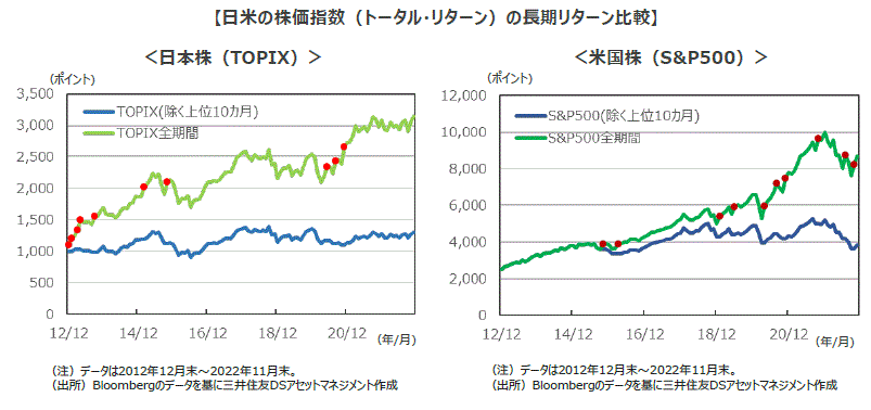 ■日本株を示した左側のグラフでは、直近(2022年11月末)のTOPIXは3,148.52ポイントでしたが、過去10年間で月間上昇率の上位10カ月を除くと1,305.30ポイントという試算結果となりました。同様に、米国株を示した右側のグラフでは、直近(同上)のS&P500は8,678.00ポイントでしたが、月間上昇率の上位10カ月を除くと3,824.04ポイントとなりました。すなわち、株価の上昇率が大きな10カ月の“上昇局面を捉えられず”に「相場に居なかった」ならば、そのパフォーマンスには大きな違いが生まれたと考えられます。