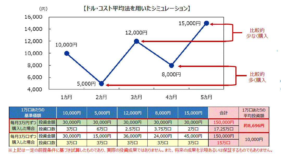 ■基準価額が10,000円の時に3万円投資すると、3万口を購入できます。一方、基準価額が下落した5,000円や8,000円の時には同じ3万円の投資でも6万口や3.75万口と、口数を多く購入することができます。すると、価格が上昇した場合に、多く購入できた口数分の上昇差益を期待することができます。また、1万口あたりの平均投資額を見ても、価格が下落した局面で購入することができれば、平均投資額を引き下げることができ、その後に価格が上昇すれば、上昇差益を期待することができます。