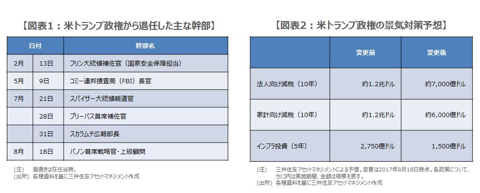 米トランプ政権では、フリン前大統領補佐官(国家安全保障担当)や、コミー前連邦捜査局(FBI)長官ら、幹部の退任が相次いでいます(図表1)。なかには、トランプ米大統領の家族(長女イバンカさんや夫のクシュナー上級顧問)との意見対立が影響しているケースもうかがわれ、政権発足から7カ月で、これほど多くの幹部が政権を離れるのは、やはり極めて異例の事態と言わざるを得ません。