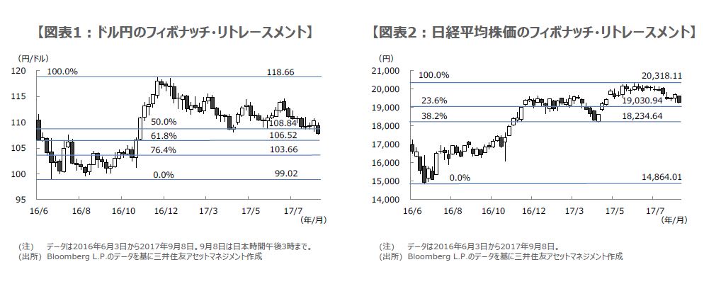 日経平均株価は、8月8日以降、終値で20,000円台の回復には至っておらず、上値の重い展開が続いています。ドル円と同様にフィボナッチ・リトレースメントを用いて、客観的な下値目途を確認しておきます。日経平均株価については、2016年6月24日の安値(14,864円01銭)から2017年6月20日の高値(20,318円11銭)までの上げ幅を基準とします(図表1)。