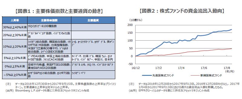 円相場と日本株の動きだけをみると、投資家はリスクを取るのに慎重な様子がうかがえますが、実は2017年の株式市場は世界的に好調です。昨年末から直近まで、米国、欧州、アジアなど新興国の主要株価指数は、おおむね日経平均株価を上回っています(図表1)。実際に、昨年末から直近まで、株式ファンドへの資金流出入動向をみると、先進国、新興国ともに安定した資金の流入が確認できます(図表2)。