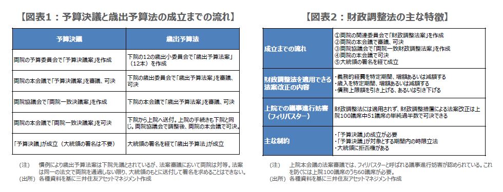 この「義務的経費」や税制を変更する場合、恒久法の改正が必要となりますが、その際、「財政調整法」が重要な役割を果たします(図表2)。「財政調整法」による審議手法を財政調整措置といい、改正法を迅速に成立させるため、審議時間は20時間に制限され、上院での法案は全100議席中51議席の単純過半数で可決されます。そのため上院で52議席を持つ共和党は、財政調整措置により、単独で税制改革案を可決することが可能となります。