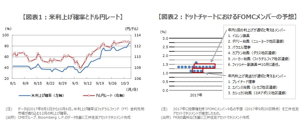 同様に、2018年末の中央値2.125%は、2017年末の中央値1.375%よりも0.75%高いため、2018年も0.25%の利上げを3回見込むFOMCメンバーが多いと解釈されます。なお、9月ドットチャートの2017年末および2018年末の中央値は、前回6月と同じ値でした。そのため市場では、足元の米物価の伸び悩みは利上げ判断に影響しないとの見方が強まり、9月のFOMC後、年内利上げの織り込みが進み、ドル円はドル高・円安方向に振れました(図表1)。