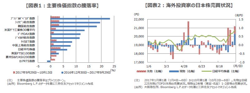 実際に日経平均株価の動きをみると、2016年12月30日から2017年9月29日までは、主要株価指数のなかでも、パフォーマンスは低調なものにとどまっていました。しかしながら、2017年9月29日から10月13日までは、最も好調なパフォーマンスに転じています(図表1)。なお、このところの日本株の上昇を主導したのは、海外投資家である可能性が高いと思われます。