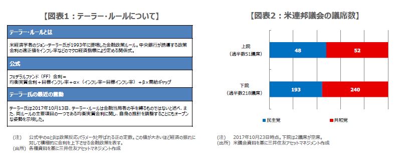 ただし、足元で米国経済が底堅く推移しているため、減税については規模が幾分縮小し、実施時期が年明けにずれ込んだとしても、景気が冷え込むリスクは極めて小さく、実施される限りは景気の下支えになると考えます。以上を踏まえると、この先、次期FRB議長が指名され、米税制改革が進むなかでも、①米金融政策の正常化はゆっくりと進み、②米長期金利の上昇はかなり抑制されるという、従来の見方を変える必要はないと思われます。