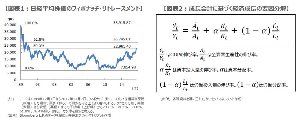 人口減少と少子高齢化が進み、労働投入量の伸び率が低下すれば、GDPの伸び率低下につながるため、前述の連想は理にかなっています。こうしたなかで経済成長を維持するには、資本投入量と全要素生産性の高い伸び、すなわち、積極投資による技術革新や生産性の向上が必要となります。その意味で、人工知能(AI)の普及や働き方改革の推進は、人口減少と少子高齢化問題への対策となり、日本株の長期的、持続的な上昇のカギを握ります。