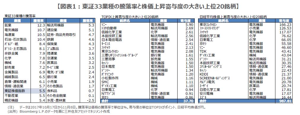 同様に、日経平均株価を押し上げた銘柄を検証してみます。同期間において、日経平均株価は7.4%、1,577円70銭上昇しました。この上昇に対し、寄与度の大きかった20銘柄は図表1の右図の通りで、1,577円70銭上昇分の987円81銭を占めます。20銘柄を業種別にみると、電気機器9銘柄、輸送用機器3銘柄、化学3銘柄、情報・通信業2銘柄などとなっています。