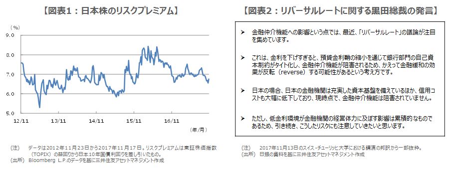 日銀の黒田総裁は11月13日、スイスのチューリッヒ大学で講演を行い、リバーサルレートについて言及し(図表2)、市場の関心を集めました。リバーサルレートとは、金利を下げすぎることで、金融仲介機能が阻害され、金融緩和の効果が反転(=リバース)してしまうという考え方です。市場では、この黒田総裁発言を、将来のマイナス金利修正に向けた地ならしとみる向きもあります。