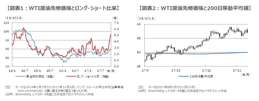 それでも、足元でWTI原油先物の買い建玉が積み上がっているということは、何らかのきっかけで投機筋が一気に買い建玉を減らせば、WTI原油先物価格は大きく下落する恐れがあるため、注意は必要です。現時点では、世界的に景気回復の裾野が広がり、主要産油国が減産合意を遵守しているため、原油の需給環境は良好です。そのため、WTI原油先物価格に調整が入っても、200日移動平均線が位置する1バレル=50ドル近辺では(図表2)、比較的サポートされやすいのではないかとみています。
