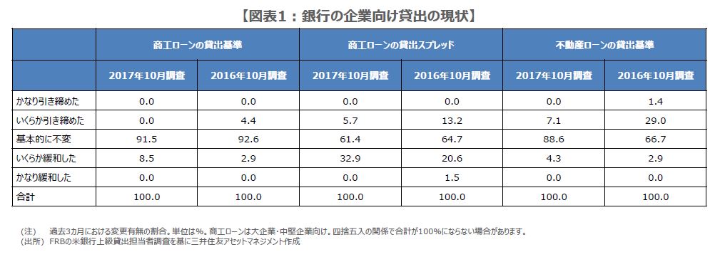一般に、金融環境がそれほど引き締まっていない場合、企業や家計の銀行借り入れは比較的容易に行われます。では実際に、米国における銀行の企業向け貸出の現状を確認してみます。米銀行上級貸出担当者調査について、2017年10月調査と2016年10月調査を比較すると、商工ローンの貸出基準と貸出スプレッド(上乗せ金利)は、ともに緩和方向に変化していることが分かります(図表1)。