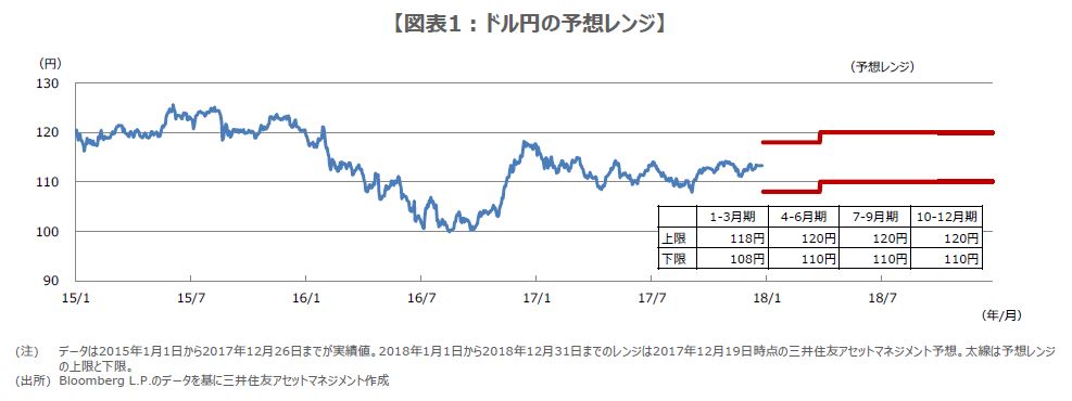 2018年のドル円相場は108円から120円のレンジ内で、ややドル高・円安方向の動きを見込む