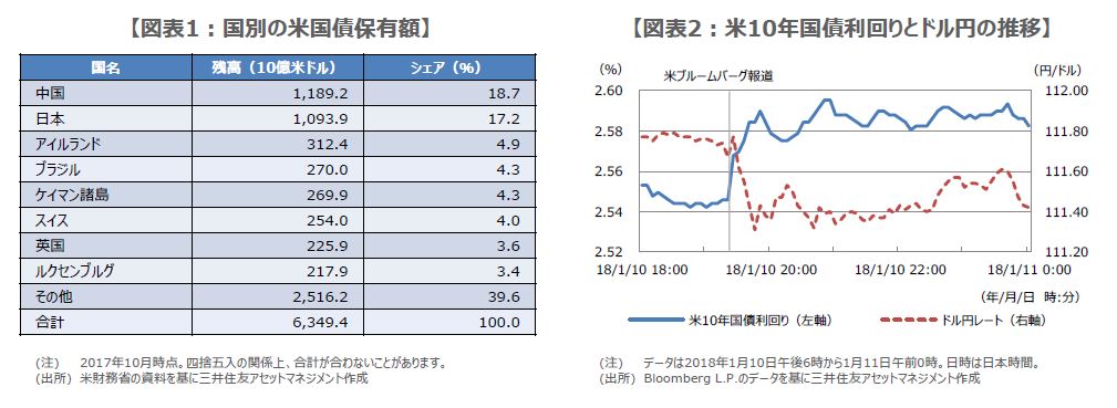 米財務省の統計によると、中国の米国債保有額は、2017年10月末時点で約1兆1,892億ドルと、国別で最大です(図表1)。そのため、実際に中国が米国債の購入減額や停止を行った場合、米国債券市場や為替市場への影響は極めて大きいものとなります。この報道を受け、米10年国債利回りは、一時2.6%近くまで上昇し、ドル円は一時1ドル=111円27銭水準までドル安・円高が進みました(図表2)。