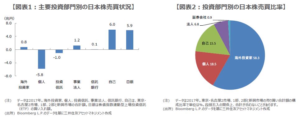 なお、自己には、日銀による株価指数連動型上場投資信託(ETF)の買い入れが含まれるとみられます。日銀は現在、ETFの保有残高が年間約6兆円に相当するペースで増加するように買い入れを行っており、2017年のETF購入総額は約5.9兆円でした。結果的に、自己の買い越し額に近い数字になっていることが分かります(図表1)。
