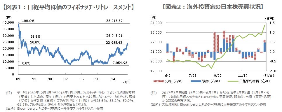 海外投資家は、2018年1月第1週に再び現物、先物ともに買い越しており、日経平均株価も年明け以降、再び上昇基調を強めています。今回、日経平均株価は一時、24,000円台を回復しましたが、足元で海外投資家による日本株買いが継続し、それが影響している可能性が高いと思われます。ただ、日経平均株価が終値で23,000円台を回復した1月4日から、わずか9営業日で24,000円台乗せとなったため、上昇ペースの速さがやや懸念されます。