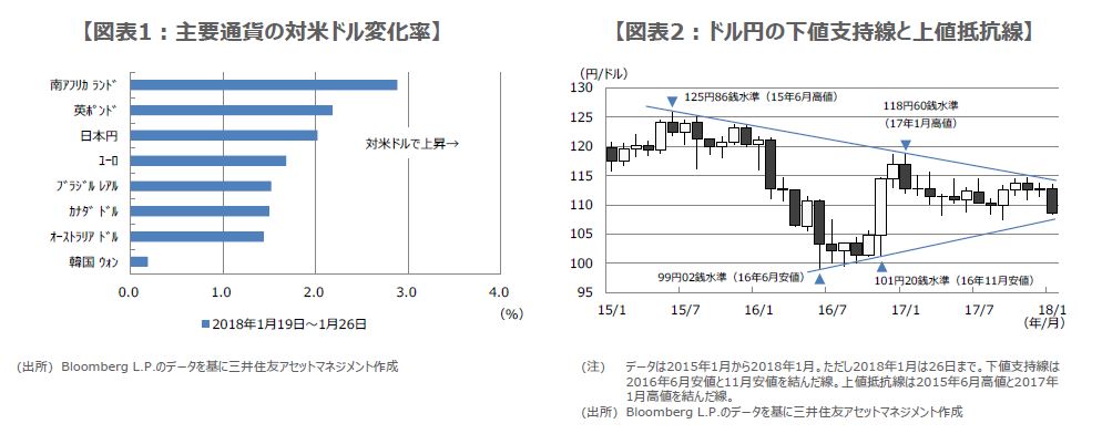 こうしたなか、欧州中央銀行(ECB)のドラギ総裁は1月25日、最近のユーロ高は物価の安定に影響を与えかねないと警戒感を示し、トランプ米大統領も同日、「私は強いドルが見たい」と述べ、前日のムニューシン発言を打ち消しました。これにより、ドル円相場も落ち着くかに見えましたが、黒田総裁が1月26日、日本は2%の物価目標にようやく近づいていると述べると、円は早期緩和解除の思惑から、対ドル、対ユーロで上昇しました。