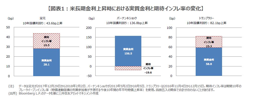 市場では、昨年から続く「適温相場」への安心感が強かっただけに、米長期金利の上昇を機に、適温相場の終わりが始まるという懸念が急浮上したとみられます。なお、米10年国債利回りは、2017年12月29日から2018年2月2日までの間、43.6ベーシスポイント(bp、1bp=0.01%)上昇しました。ここで、名目金利である国債利回りの動きについて、実質金利と期待インフレ率に分けて検証してみます。