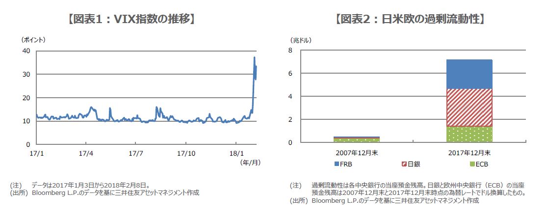 長期にわたって低位安定推移したボラティリティがその反動で急騰した結果、VIX連動商品やリスク・パリティ戦略が株式相場の下げを一時的に加速させた可能性はあります。ただ、日米の経済環境や企業業績の見通しは良好で、金融システムには依然、巨額の流動性が存在します(図表2)。株価はしばらく不安定な動きが続くと思われますが、株式の本源的価値は、投機的な金融商品やポートフォリオ戦略によって決まるものではありません。