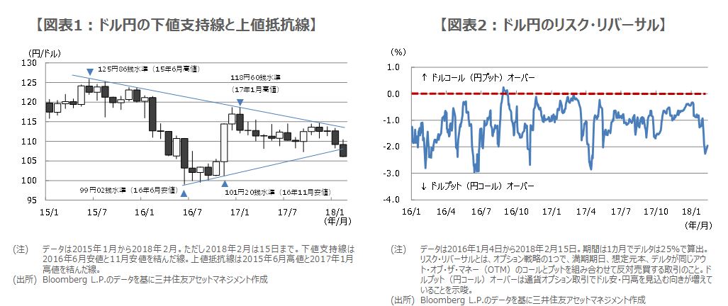 ただ、ドル安・円高の速度には注意が必要です。図表1をみると、ドル円の日足はすでに下値支持線を下抜けていることが分かります。下値支持線は今週末、1ドル=108円近辺に位置していますので、日足がこの水準を下抜けて越週すると、来週以降、ドル安・円高の動きが加速する恐れもあります。また通貨オプション取引でも、ドル安・円高の進行に備える動きがうかがえます(図表2)。