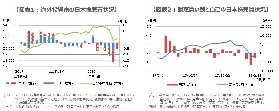 海外投資家は2017年9月第2週から10月第4週にかけて、日本株の現物や先物を大幅に買い越しましたが、その期間の日本株は大きく上昇しました。一方、海外投資家は2018年1月第2週から2月第2週にかけて、日本株の現物や先物を大幅に売り越しましたが、その期間の日本株は大きく下落しました(図表1)。このように、海外投資家の売買動向は日本株の方向性に大きな影響を与えています。
