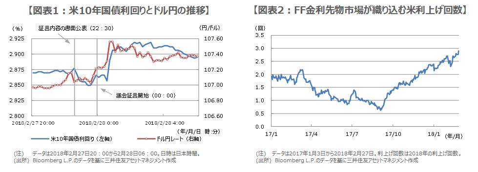 市場はパウエル議長のこの発言をややタカ派的と解釈し、利上げペースの加速に備える動きを示しました。米10年国債利回りが一時2.9%台まで水準を切り上げると、ドルは対主要通貨で買い優勢となり、対円で107円台後半まで上昇しました(図表1)。一方、米国株式市場では、金利上昇に対する警戒感が強まり、ダウ工業株30種平均は前日比で299ドル24セント下落しました。