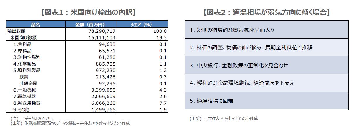 追加関税は鉄鋼が25%、アルミニウムが10%で、全ての国に適用される見通しです。なお、2017年において、日本の輸出全体に占める米国向け鉄鋼の輸出シェアは約0.3%、アルミニウムを含む非鉄金属の輸出シェアは約0.1%ですので、日本の輸出全体に及ぼす影響は限定的と思われます(図表1)。また、ロス米商務長官は3月2日、関税引き上げの米国内への影響について、35,000ドルの自動車なら0.5%の値上がりに過ぎず、問題ないとの見解を示しました。