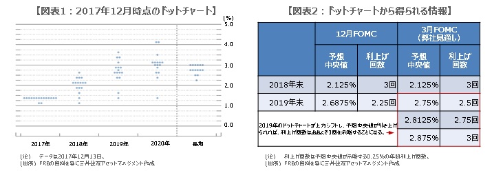 政策金利の見通しはドットチャートによって示されます。ドットチャートとは、FOMCメンバーが適切と考える政策金利水準の分布図です。前回12月のドットチャートは図表1の通りです。2017年末の予想中央値は1.375%、2018年末は2.125%、2019年末は2.6875%、2020年末は3.0625%、長期(Longer run)は2.75%でした。これらが示唆する、0.25%の利上げ回数は、2018年が3回、2019年が2.25回、2020年が1.5回となります。