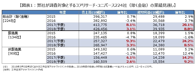 弊社は調査対象とする主要企業224社(金融を除く)について、2017年度の売上高は413.8兆円(前年度比+8.1%)、経常利益は36.7兆円(同+20.1%)の着地を予想しています(図表1)。さらに、2018年度は売上高が426.5兆円(同+3.1%)、経常利益が39.9兆円(同+8.8%)と、伸び率は幾分鈍化するものの、前年度に続き増収増益を見込んでいます。製造業(134社)と非製造業(90社)に区分した場合でも、そろって増収増益が続く見通しです。