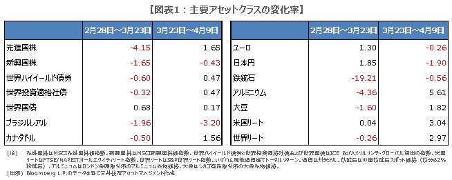 米中両国は3月以降、貿易摩擦問題を巡って対立姿勢を強め、金融市場では貿易戦争に発展するのではないかとの懸念が広がりました。具体的に、2月28日から3月23日(中国が米国製品計128品目に関税上乗せ準備をしていると発表した日)までの主要アセットクラスの動きをみると、株価や社債価格が下落し、国債価格が上昇するなど、典型的なリスクオフの流れが確認できます(図表1)。