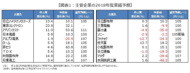 日本では先週、上場企業の2017年度決算発表が前半のピークを迎えました。そこで今回のレポートでは決算前半のポイントと今後の注目点について整理します。まず、半導体関連では、日立ハイテクノロジーズ、東京エレクトロン、アドバンテストなどが決算発表を終えました。この3社は、2018年度の業績について、いずれも2ケタの増収増益を予想しています(図表1)。