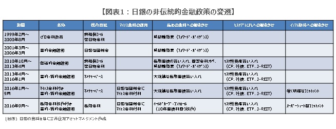 今回のレポートでは、日銀の非伝統的金融政策について、これまでの歩みを簡単に振り返ってみます。各政策を実施された順に整理すると、①「ゼロ金利政策」、②「量的金融緩和」、③「包括的金融緩和」、④「量的・質的金融緩和」、⑤「マイナス金利付き量的・質的金融緩和」、⑥「長短金利操作付き量的・質的金融緩和」となります(図表1)。以下、各政策の特徴を簡単にまとめます。