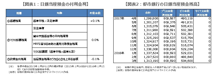 マイナス金利付き量的・質的金融緩和における日銀当座預金の付利金利は図表1の通りです。ごく簡単に言うと、法定準備は従来通りゼロ%、超過準備は2015年程度までは+0.1%、それを超える分は-0.1%という内容です。ただ、長期国債の買い入れなどは継続されるため、-0.1%の対象額は膨れ上がります。そこで日銀は、貸出支援基金等の平残やマクロ加算額などは0%の付利とし、マイナス金利の影響が大きくなり過ぎないように配慮しました。