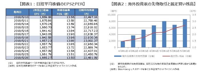 日経平均株価の予想1株当たり利益(EPS)について、5月10日から5月28日までの推移をみると、1,640円~1,670円台で、比較的落ち着いていることが分かります(図表1)。この数字は、3月決算企業が決算発表で公表した、今期の利益予想を反映しています。一方、株価収益率(PER)の動きを確認すると、5月10日は13.56倍でしたが、日経平均株価が23,000円台を回復した5月21日に向けて、14倍付近まで上昇しています。