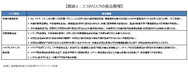今回は、市場で懸念される3つのリスクを検証し、日本株への影響について考えます。3つのリスクとは、①米国の保護主義的な通商政策が世界景気に悪影響を及ぼすリスク、②米朝首脳会談の内容が市場の失望を誘うリスク、③イタリアとスペインの新政権が抱える問題で市場が不安定になるリスクです(図表1)。まず、①について、トランプ米政権の通商政策は最近、再び保護主義色を強めています。