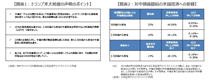 トランプ米大統領は6月18日、米通商代表部(USTR)に対し、10%の追加関税を課すため、2,000億ドル相当の中国製品を特定するよう指示したとの声明を発表しました(図表1)。同声明では、中国が対抗して関税を引き上げた場合、更に2,000億ドル相当の中国製品に追加関税を課す方針も示されました。米国は現在、500億ドル相当の中国製品に制裁関税の発動準備を進めていますので、今後の制裁規模は最大で4,500億ドルに達することになります。
