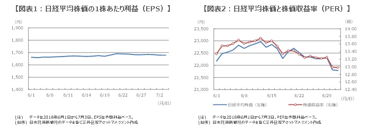 日経平均株価は7月2日、米中貿易摩擦問題などを嫌気した売りに押され、節目の22,000円を割り込んで大きく下落しました。翌3日も続落し、この日の終値は21,785円54銭、予想利益ベースの株価収益率(PER)は12.98倍、1株あたり利益(EPS)は1,678円39銭となりました。このところ、EPSは安定的に推移しているため(図表1)、7月2日と3日の株安は、PERの低下が影響したとみられます(図表2)。