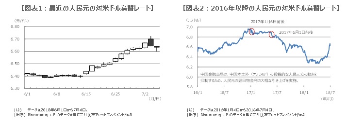 人民元の対米ドル為替レートは、6月15日から7月3日にかけて、大きく元安・ドル高方向に振れました(図表1)。貿易摩擦問題で米中両国の歩み寄りはみられず、7月6日に340億ドルの制裁関税が相互に発動される可能性が高まってきたため、市場の一部には、中国当局が自国の輸出を下支えするために、元安を容認しているのではないかとの思惑が広がっています。