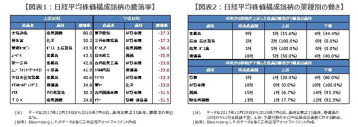 今回のレポートでは、2018年前半の日本株の動きを振り返り、上昇した銘柄と下落した銘柄の顔ぶれから、相場のテーマを探ります。検証の対象は、日経平均株価と、それを構成する225社です。まず、日経平均株価全体について、2017年12月29日を基準とした2018年7月6日までの騰落率は-4.3%でした。日経平均株価は年初、米長期金利上昇を嫌気して、大きく下落しましたが、その後も上値の重い展開が続いています。