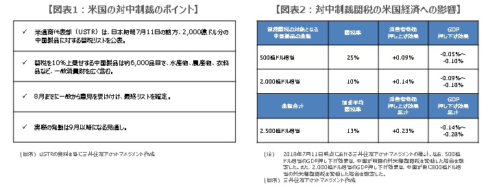 米中貿易摩擦問題に関する今後の焦点は、トランプ米政権が2,000億ドルや3,000億ドルという巨額の制裁関税を、本気で発動するか否かです。現時点では、トランプ米政権側に手を緩める様子はみられず、むしろ一層、強気に傾いているように思われます。実際、日本時間7月11日の朝方、米通商代表部(USTR)は、2,000億ドル分の中国製品に対する関税リストを公表しました(図表1)。