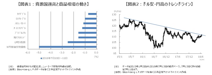 なお、石油輸出国機構(OPEC)は7月11日、OPEC非加盟国からの原油供給が来年は5年ぶりの大幅増になるとの見方を示しました。これが同日の原油の急落につながり、ドル高・円安の動きをやや大きくしてしまった面もあるため、少し注意が必要です。それでも、米中貿易摩擦のエスカレートでドル高・円安という反応は、商品相場と資源国通貨の動き次第で、今後もみられる可能性があります。