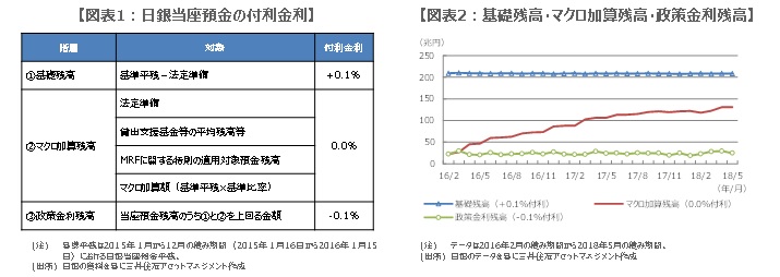 国債買い入れの継続により、超過準備残高は増加し続けますので、日銀はこれまで基準比率を段階的に引き上げてきました。その結果、当初0.0%だった基準比率は、3カ月毎に見直され、現在30.5%に達しています。つまり、日銀は、基準比率を引き上げ、超過準備残高の増加分をマクロ加算残高(0.0%付利)に転嫁することで、政策金利残高(-0.1%付利)が一定となるよう、コントロールしていることになります(図表2)。