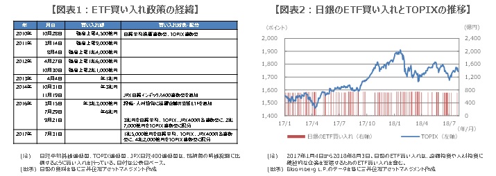 一方、投資信託協会が発表している株式追加型ETFの純資産残高は、2018年6月末時点で約34.2兆円でした。単純計算すれば、日銀の保有比率は75.7%となるため、日銀はETF市場でかなり存在感の大きい取引主体です。なお、日銀によるETFの買い入れは、リスク・プレミアムの縮小を促すことが目的です。実際、過去の株価の推移とETF買い入れのタイミングをみると、株価上昇局面では買い入れが手控えられており、日銀に株価押し上げの意図はみられません(図表2)。
