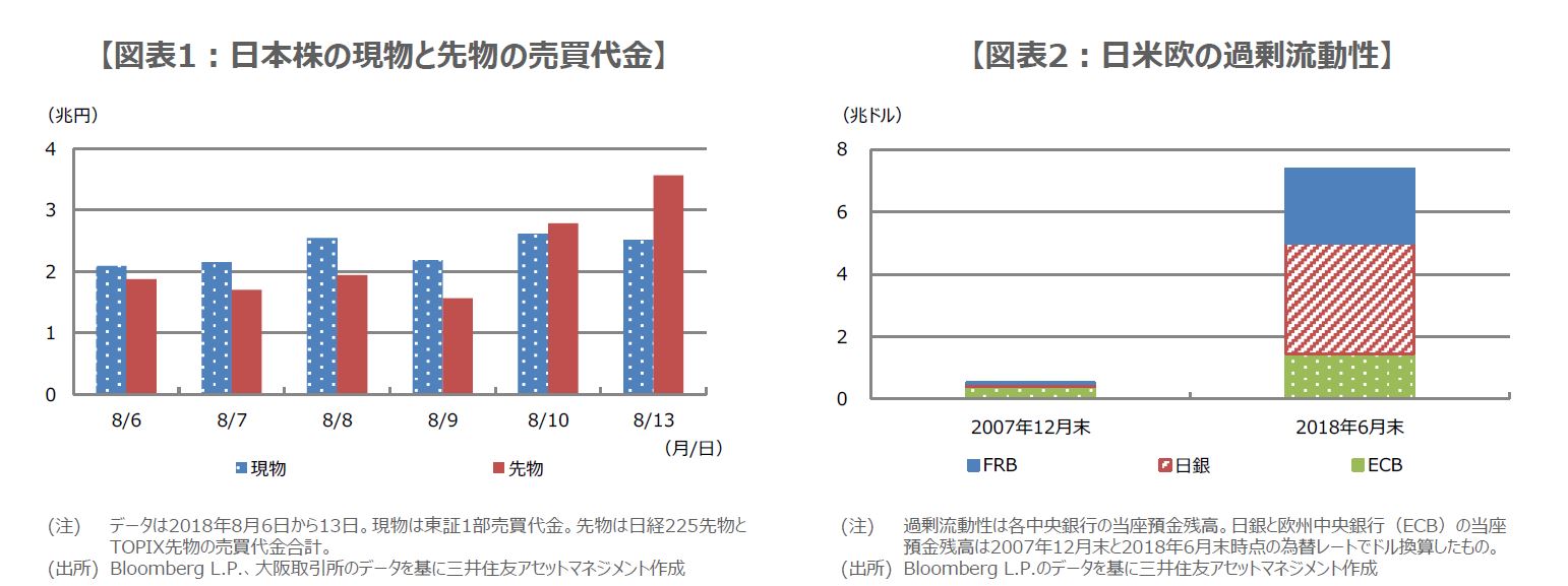 グローバルな視点からみた場合、米連邦準備制度理事会(FRB)、日銀、欧州中央銀行(ECB)の当座預金には、6月末時点で合計約7.4兆ドルの過剰流動性が積み上がっています(図表2)。これは各国・地域の民間銀行が抱える余剰資金ですので、トルコリラの下落が世界的な金融危機に発展するリスクは極めて小さく、日本株投資にも冷静に対処できると考えます。弊社は主要企業の業績について、今期も通期で増収増益の着地を見込んでおり、2019年3月末時点の日経平均株価は23,800円程度の予想を維持しています。