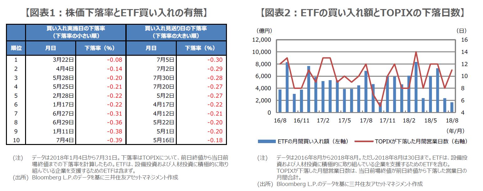 日銀がETFの買い入れを行うのは、東証株価指数(TOPIX)の前場の終値が、前日の終値から一定程度、下落した日です。日銀は過去、下落率が1%を超えると買い入れていましたが、2015年からは0.2%程度の下げでも買い入れるようになり、2015年半ば以降は下落率に明確な基準はみられなくなりました。その傾向は現在でも続いており、2018年の年初からは、少なくとも下落率が0.3%を超える日に買い入れが行われています(図表1)。