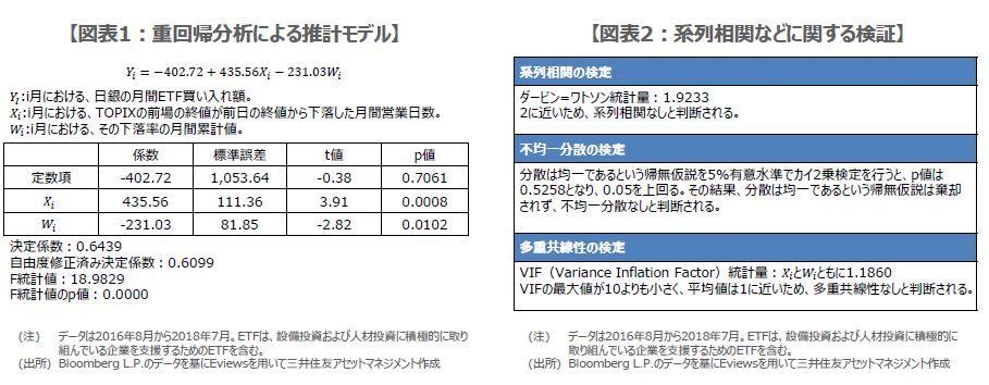 前回のレポート「日銀のETF買い入れは減額に向かうのか?」では、日銀のETF買い入れ額と東証株価指数(TOPIX)の変化率に関する時系列データを収集しました。今回はそれらを基に、日銀によるETFの買い入れ額を推計するモデルを構築します。具体的には、日銀の月間ETF買い入れ額を被説明変数、TOPIXの前場の終値が前日の終値から下落した月間営業日数と、その下落率の月間累計値を説明変数として、重回帰分析を行います。
