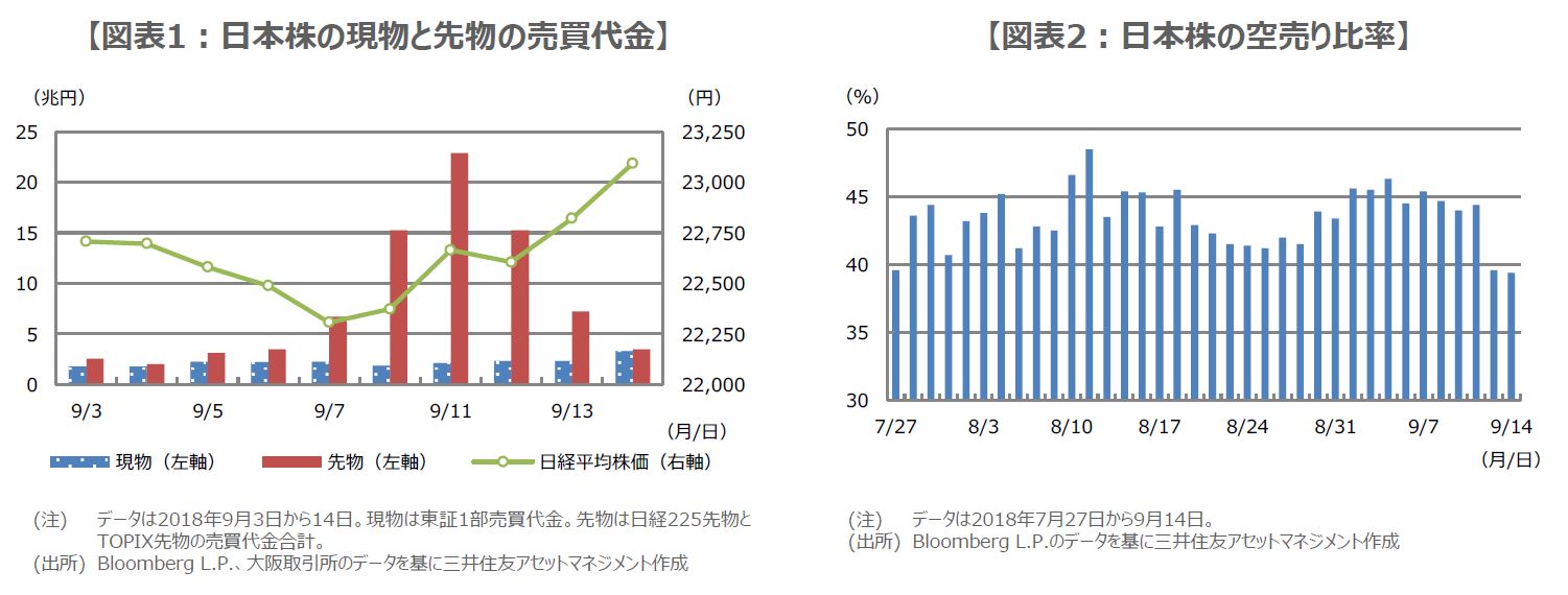 先週は9月14日が、株価指数先物・オプションの「特別清算指数(SQ)」の算出日でした。そのため、海外投機筋など短期の投資家が、SQ絡みの先物買いを断続的に入れ、これが現物株を押し上げた可能性があると思われます。実際、9月に入ってからの株式売買代金をみると、特に先週は先物が現物を大きく上回っており(図表1)、日経平均株価の23,000円台回復は、先物主導に起因するものだったと推測されます。
